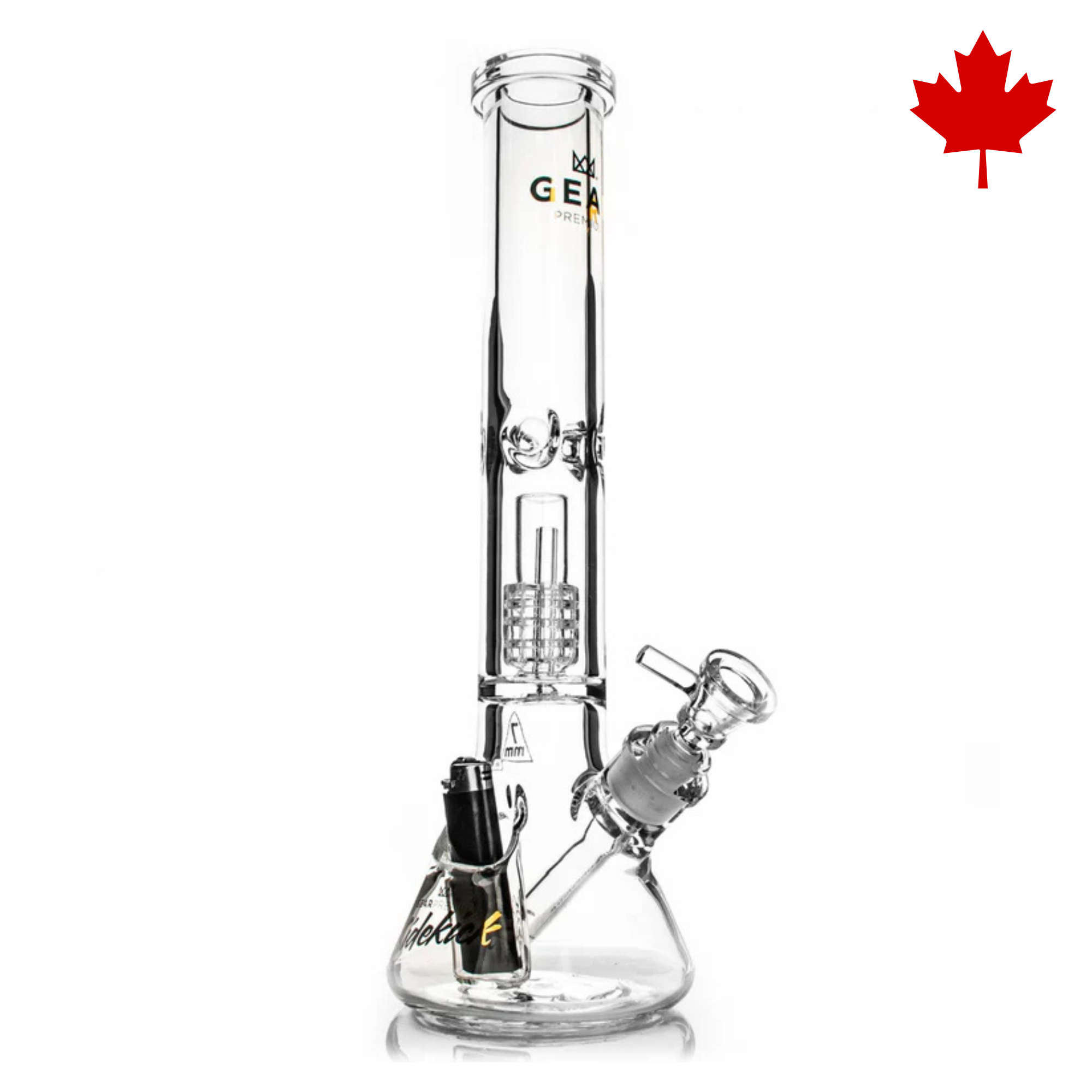 Meet the ultimate smoke show of the GEAR Premium® Sidekick Collection. This borosilicate beast boasts a beaker base shape featuring an ultra-thick 7mm design with the golden touch - a 24K gold GEAR Premium® decal. What truly sets it apart from the competition is the dual-chambered filtration system with a handblown barrel dome perc for silky-smooth sessions. Don't forget the patented lighter holster, uniting the best of function and performance into the ultimate smoking Sidekick. Canadian Based Company.
