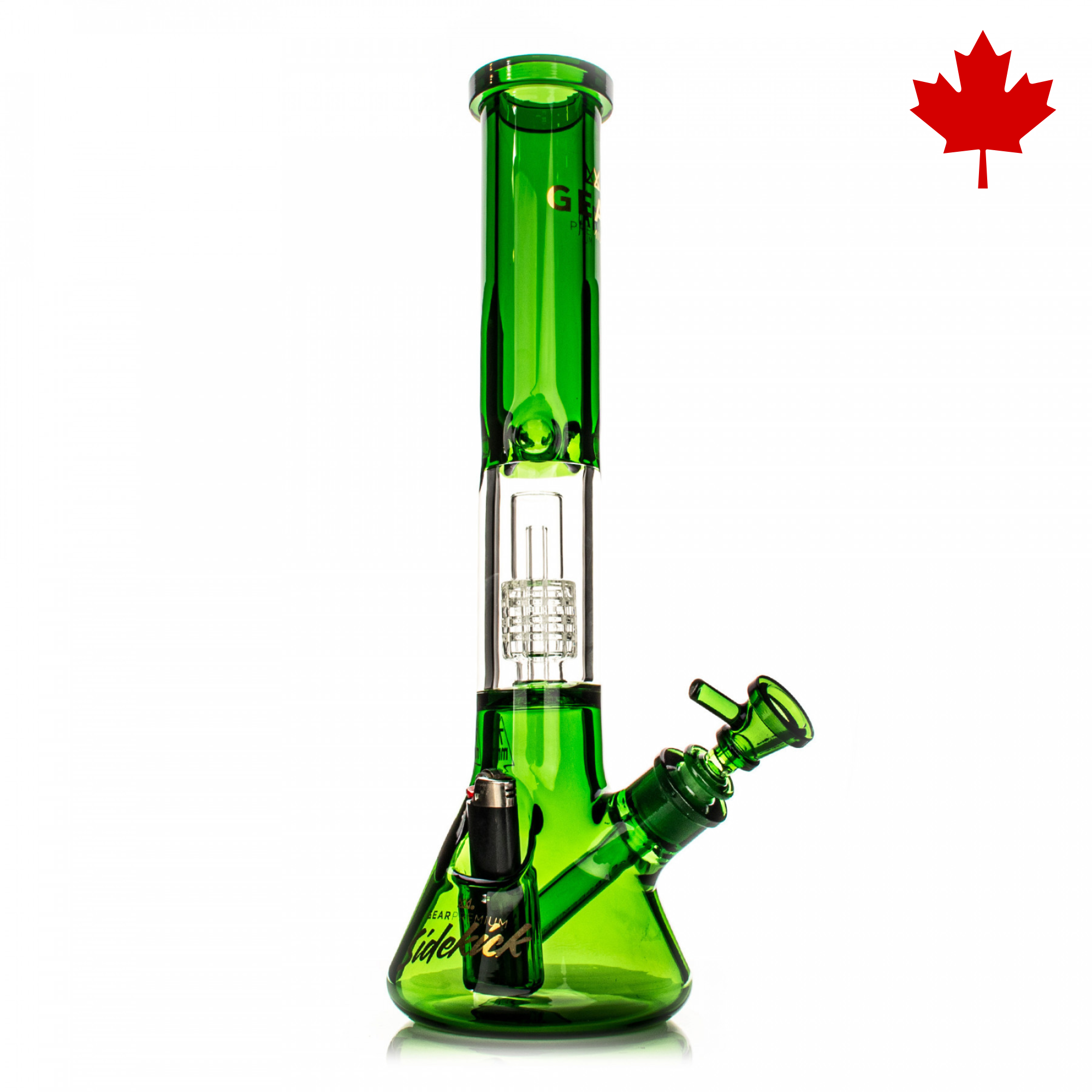 Meet the ultimate smoke show of the GEAR Premium® Sidekick Collection. This borosilicate beast boasts a beaker base shape featuring an ultra-thick 7mm design with the golden touch - a 24K gold GEAR Premium® decal. What truly sets it apart from the competition is the dual-chambered filtration system with a handblown barrel dome perc for silky-smooth sessions. Don't forget the patented lighter holster, uniting the best of function and performance into the ultimate smoking Sidekick. Canadian-Based Company.